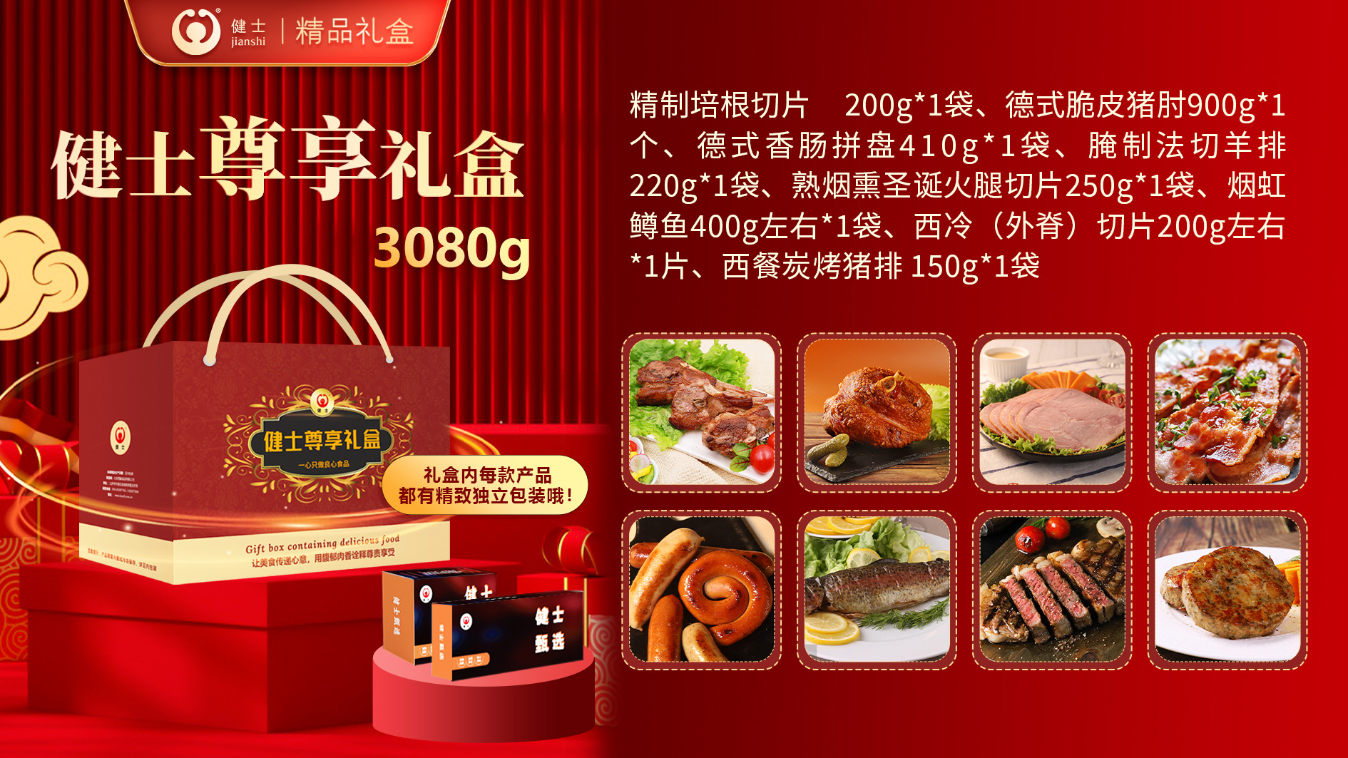 禮盒內(nèi)包含谷飼牛排、法切羊排、鵝肝丕、火雞腿、德式烤肘、經(jīng)典西式香腸以及培根等產(chǎn)品,還原濃郁異域風(fēng)味,無需繁瑣操作,在家就能享受星級西餐體驗(yàn)!