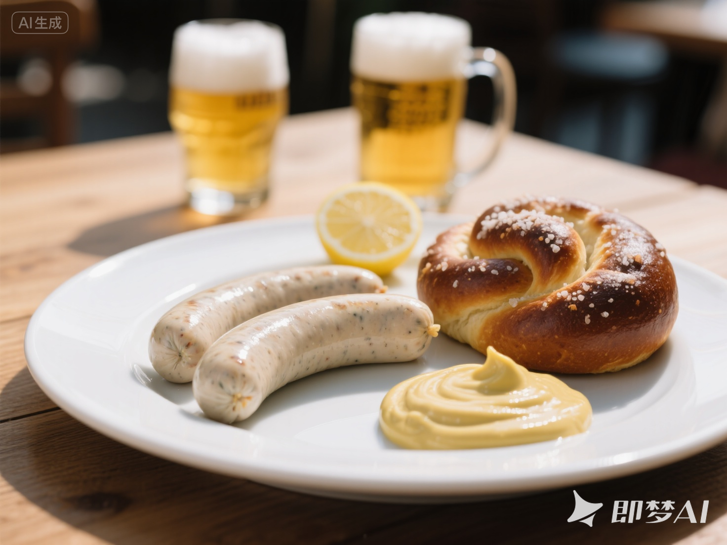 ⑥ 享用: 按照傳統(tǒng),用手拿起香腸,咬開(kāi)一端,吸食其中鮮美的肉餡。搭配扭結(jié)包蘸甜芥末醬,并擠上少許檸檬汁提味。佐以冰鎮(zhèn)的白啤酒。