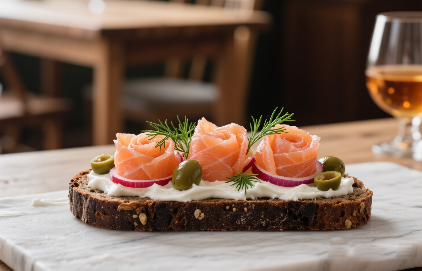 特點(diǎn):黑麥面包的質(zhì)樸谷物香與三文魚的細(xì)膩油潤相得益彰。
